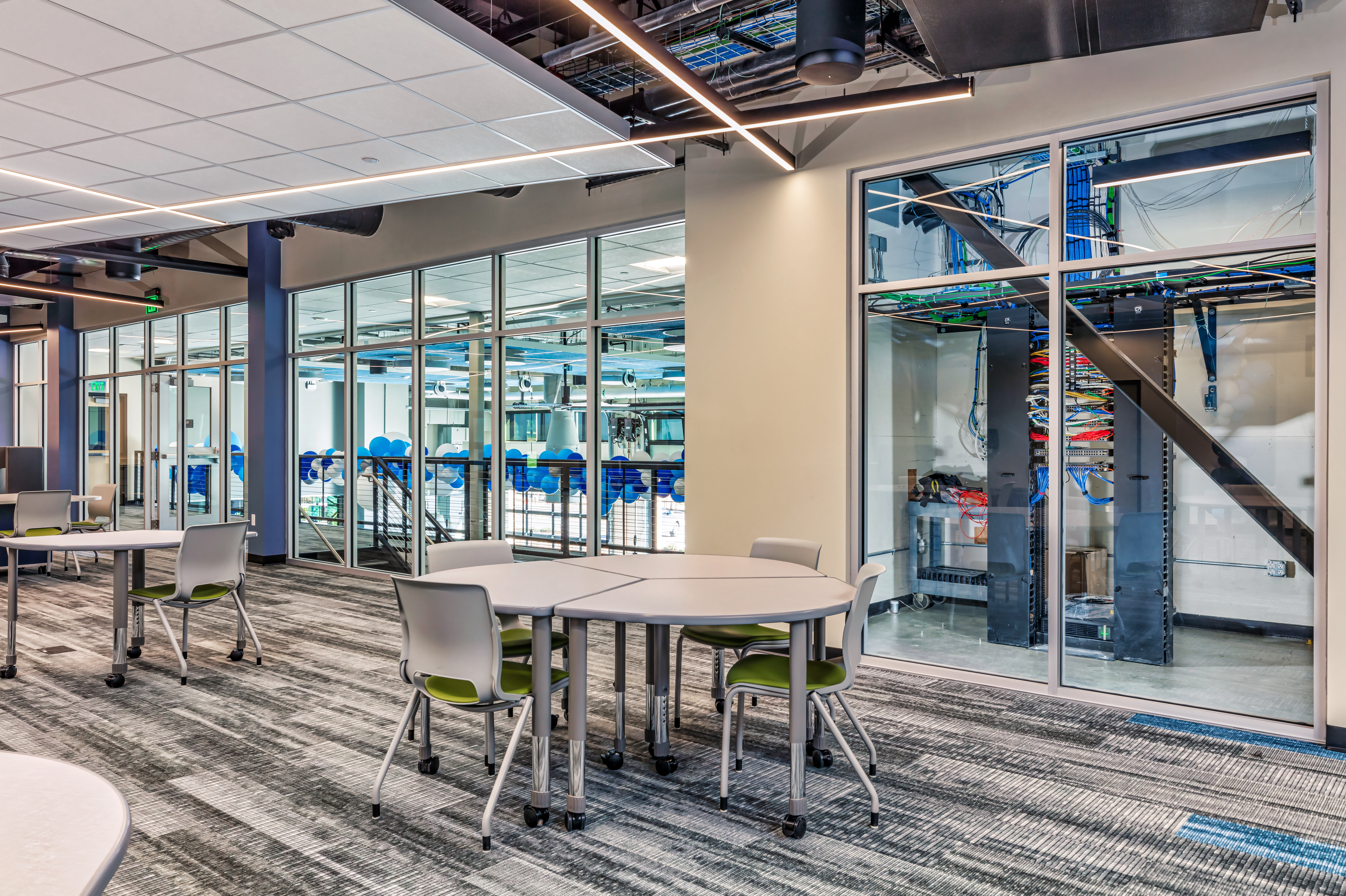 The Innovation Center serves as both an educational hub and campus welcome center, creating the first destination for visitors and prospective students. The facility incorporates four high school-level laboratories, three middle school-level laboratories, one K-5-level laboratory, computer labs, and specialized workshop spaces. The building design emphasizes visual connections to the outdoors and campus features while putting internal activities on display through intentional transparency.