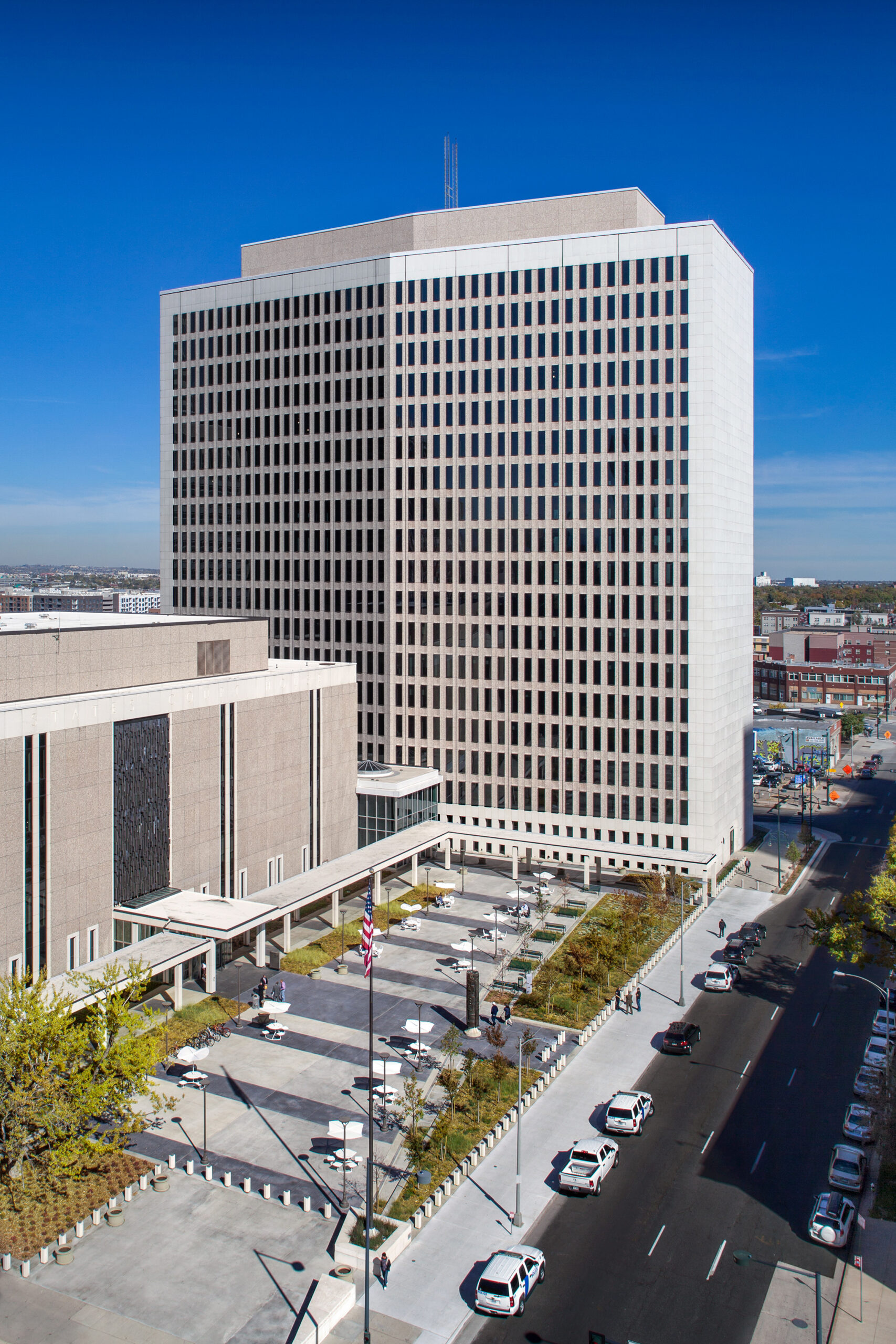 Home to 11 federal agencies, the Byron G. Rogers Federal Office Building in downtown Denver was targeted by its owner, the U.S. General Services Administration, for an extensive modernization project to significantly improve energy efficiency and deliver advanced updates to this important example of 1960s-era Federal architecture. This design-build project involved comprehensive upgrades to all major building systems housed within the 18-story, 494,000-square-foot office tower and minor improvements to the adjacent courthouse. The upgrades are projected to reduce energy use in the office tower by nearly 70 percent relative to current levels.