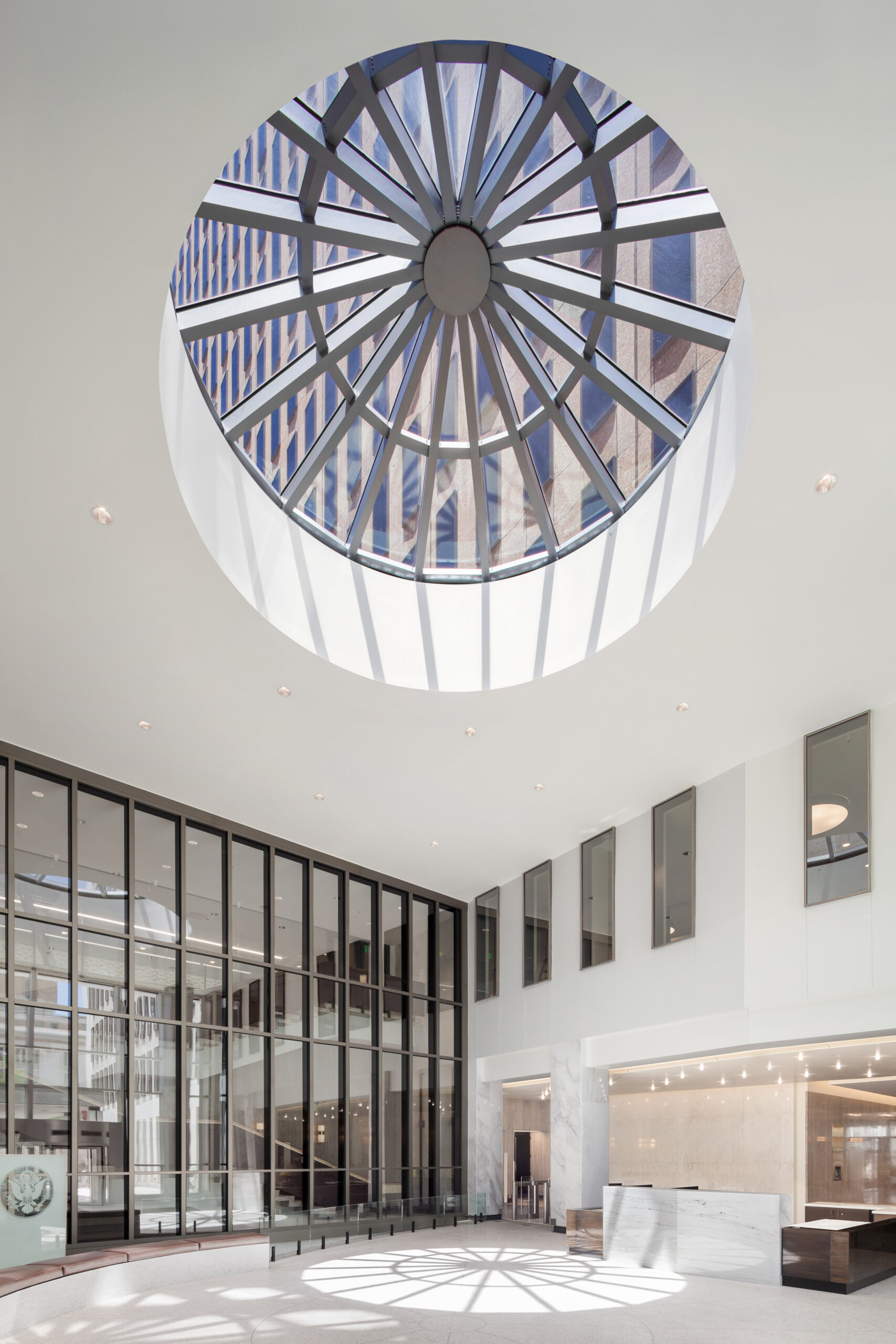 The retrofitted building features additional energy-saving technologies, including 100% LED lighting, enhanced daylighting, and roof-mounted solar thermal collectors that provide all of the building’s domestic hot water. Water-conserving strategies are expected to reduce water use by 40 percent. The comprehensive modernization positions this Federal facility as a model for sustainable government building operations while preserving its architectural significance.